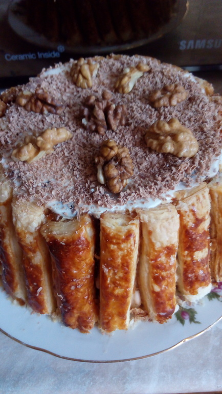 Берем одну пластинку слоеного теста, слегка раскатываем ее и режем пополам. Нарезаем полоски 1-1,5 см шириной. Высота, полосок должна совпадать с высотой бортика формы, в которой этот десерт будет собираться. Выкладываем полоски на противень, с пергаментной бумагой, смазываем желтком, немного присыпаем сахаром и выпекаем до готовности. Минут 20-25.