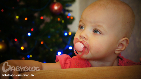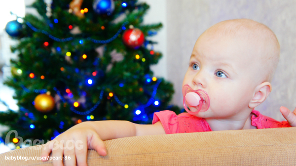 Новогодняя Аришка))) Прелесть))) Только вот с кашлем обидно((( Лечитесь, дорогие!!!Как вообще малышка на елку реагирует? Не пытается игрушки снять?