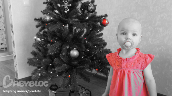 В выходные папа нам елку нарядил! Теперь у нас в доме витает новогоднее настроение! Арина пошла на поправку 3 дня назад! Вчера бегала, прыгала, визжала от восторга возле нас, а сегодня ночью появился лающий кашель!Хрипит! Дождалась 9:30 и позвонила нашему врачу! Приходила Назначила еще микстур! Тт скачет, то 36,7, то 37,2! Но не смотря на все наши болячки, проводили врача и взяли фотоаппарат в руки! Доча особо не позировала! Сложно было ее даже возле елки поставить, но из ста фотографий получилось несколько, где Аринка на фоне нашей елочки! Ну и конечно же опять с соской во рту и сыпью на лице! Далее фото