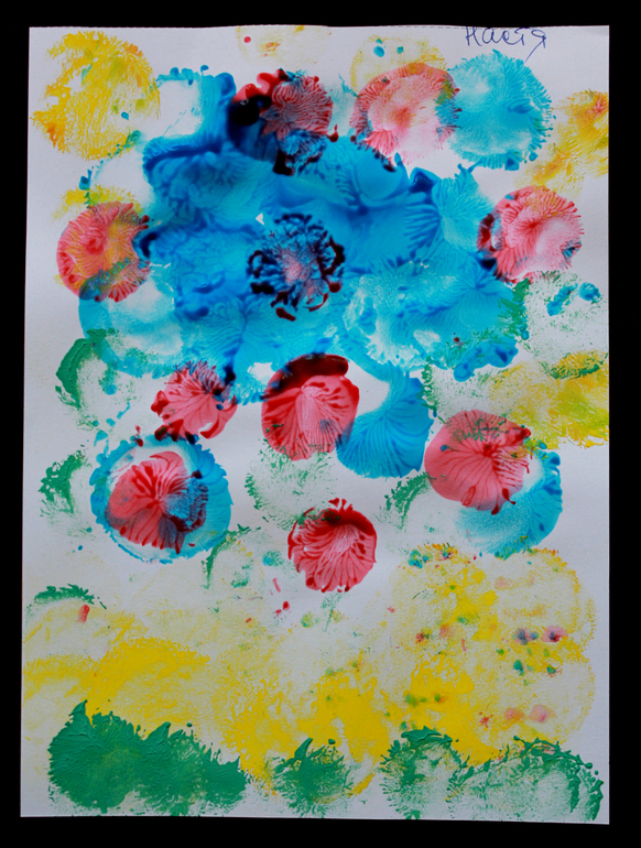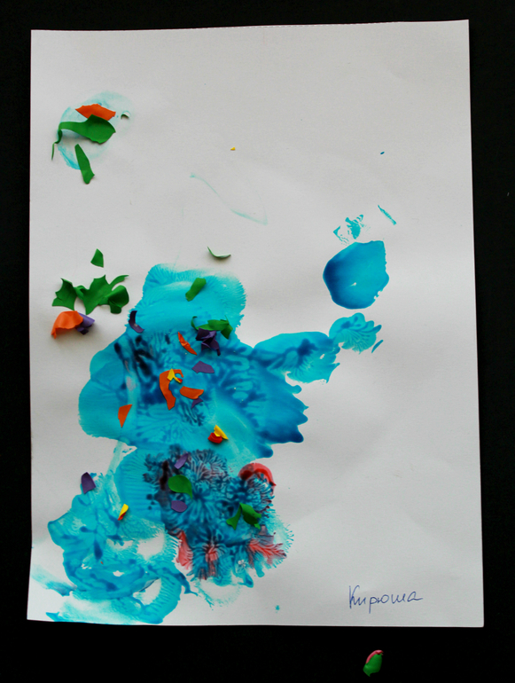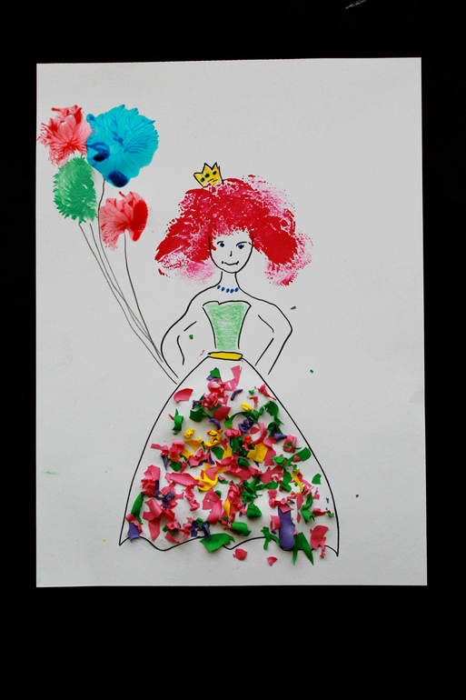 Волосы принцессы и сами воздушные шары - это оттиски шариков в краске. А низ платья - это мелко порезанные лопнувшие шарики. Шарики мы специально лопали ногами.