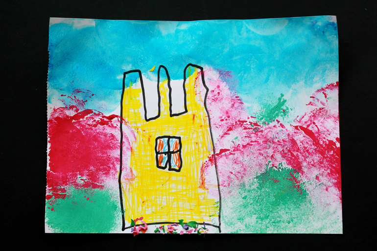 Замок нарисовала Натали, она же сделала небо голубого и розового цветов. Дашуня делала травку. Мы с Натали разрисовали желтым замок, я - оформила окно и украсила кусочками лопнувших шариков дворик у замка.