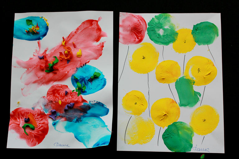 Работы Даши. Слева - в первой группе она рисовала, справа во второй. Я дорисовала ножки и получились цветы.
