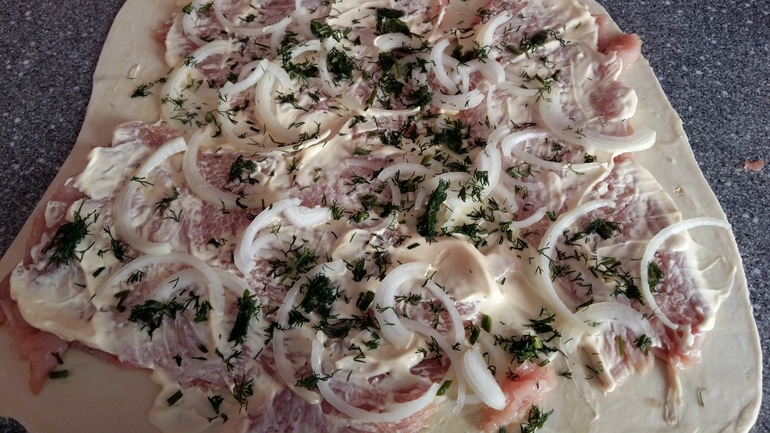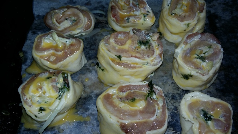 раскатываем слоенное тесто. Отбиваем куриное филе выкладываем на тесто. Солим, перчим. Смазываем майонезом. Крошим полукольцами лук. Можно зелень. Сворачиваем в рулет. Режем на порционные кусочки. Смазываем желтком. Выпекаем в духовке до готовности