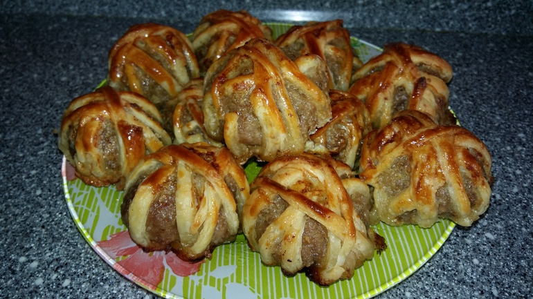 Думаю здесь не раз мелькал рецепт мясных шариков в слоенном тесте. Если кому нужно, рецепт напишу