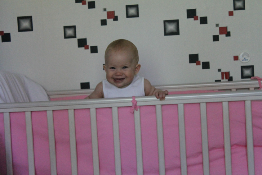 А это уж большемесячное фото. Одна из первых удачных попыток встать самостоятельно в кровати - дикий восторг читается на маленькой моське.