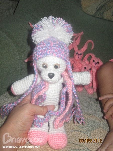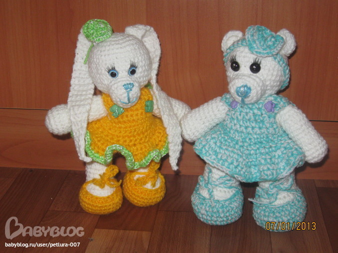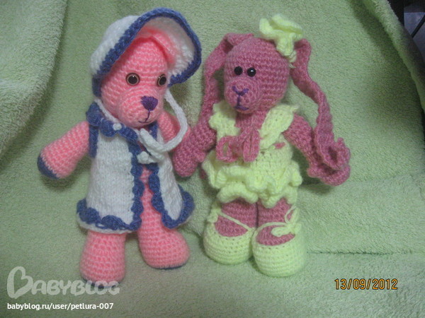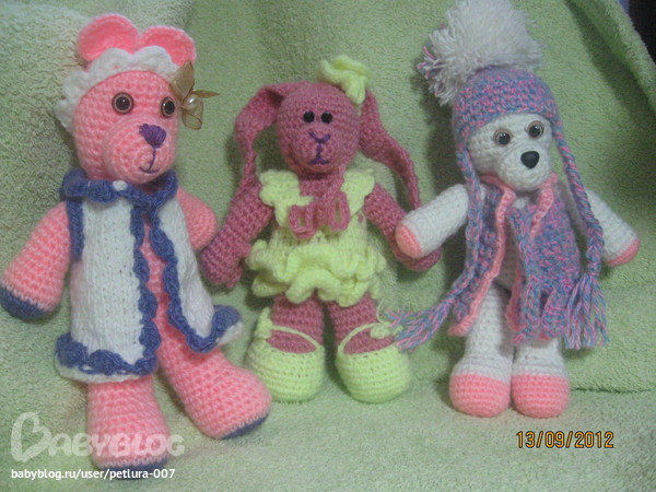 Итак....начнем с моих умелок....я вяжу игрушки крючком(детали бывает спицами)....очень люблю это дело.....мастером себя не считаю....но мои игрушки очень любимы в кругу друзей/знакомых/соседей)))))))) Чем несказанно горда и очень по человечьи рада))) Это незабываемо-детская улыбка!!!! А когда еще и с гардеробом-то вообще хорошо....так что смотрите что покажу))) вот мои детки..Могу связать любую игрушку на заказ.....цена-спрашивайте....цвет можно другой.....и глазки теперь у всех будут как у мышки)))))) Заказы отправляю почтой....