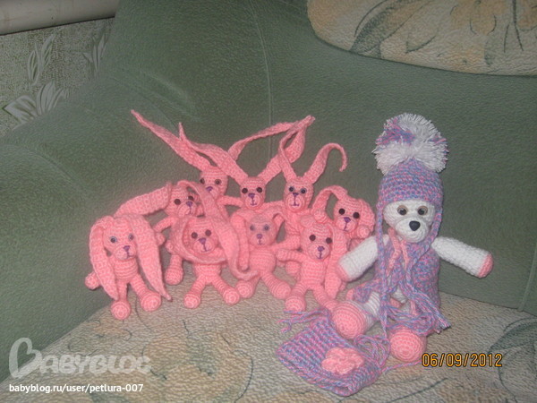 такие все класные!!!!молодец!!!!семейство розовых зайцев отпадное!!!!а ежиков умеешь вязать?