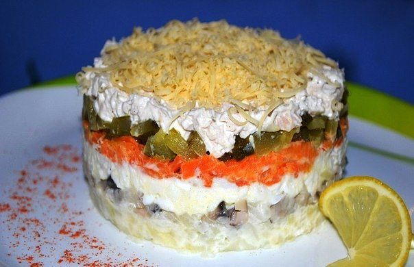 5. Салат "Мельник" Ингредиенты: Картофель отварной - 4 Штуки Грибы маринованные - 200 Грамм Лук репчатый - 1 Штука Яйца вареные - 3 Штуки Мясо отварное - 250 Грамм Огурец соленый - 2 Штуки Морковь отварная - 1 Штука Сыр - 100 Грамм Майонез или сметана - По вкусу Перец черный молотый - По вкусу Соль - По вкусу