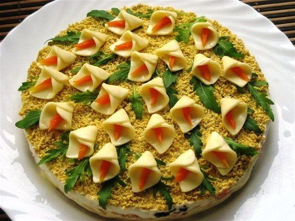 11. Сверху салата выкладывать завернутые конвертиком кусочки сыра. Внутрь каждого вложить кусочек моркови. Украсить салат свежей зеленью. Необыкновенно красивый и очень вкусный салат "Каллы" в домашних условиях готов к подаче.