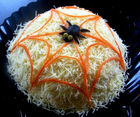 11. Маслины нарезать и с их помощью сделать паучка. Глазками могут стать горошины. Вот такой оригинальный салат "Паутинка" в домашних условиях можно подать на праздник. Ингредиенты: Куриное филе - 300 Грамм Грибы - 300 Грамм Луковица - 1 Штука Растительное масло - 1 Ст. ложка Сыр - 200 Грамм Яйца - 5 Штук Морковь по-корейски - 300 Грамм Майонез - 200 Грамм Маслины - 2-3 Штук Зеленый горошек - 2 Штуки Соль - 1 Щепотка Перец - 1 Щепотка