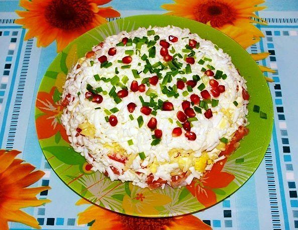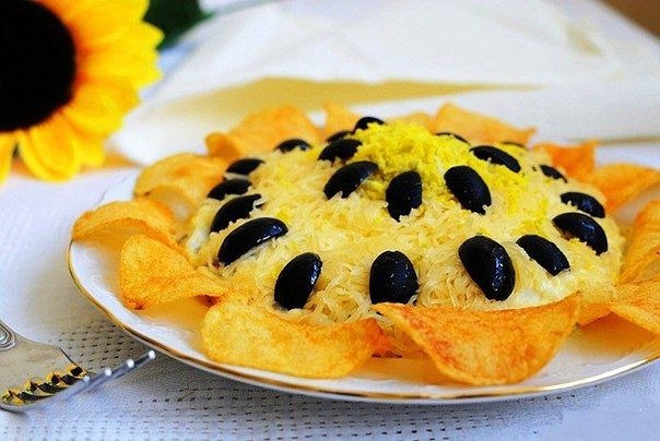 1. Салат "Подсолнух" с кукурузой Салат "Подсолнух" с кукурузой - красочный, вкусный, порадует и детей, и взрослых. Он всегда привлекает внимание своим видом и отличается отменным вкусом.