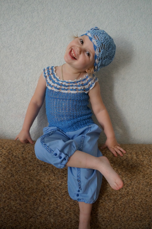 Шапуля и топик - пряжа Анна, штанишки - рукава папиной (форменной) рубашки