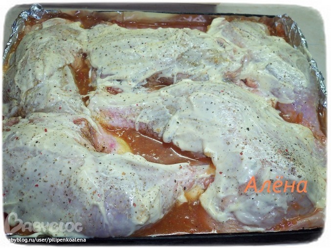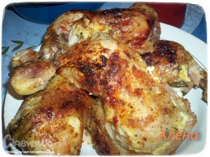 Курицу, в даном случае окорочка вымыть, обсушить и замариновать в смеси любимых специй.