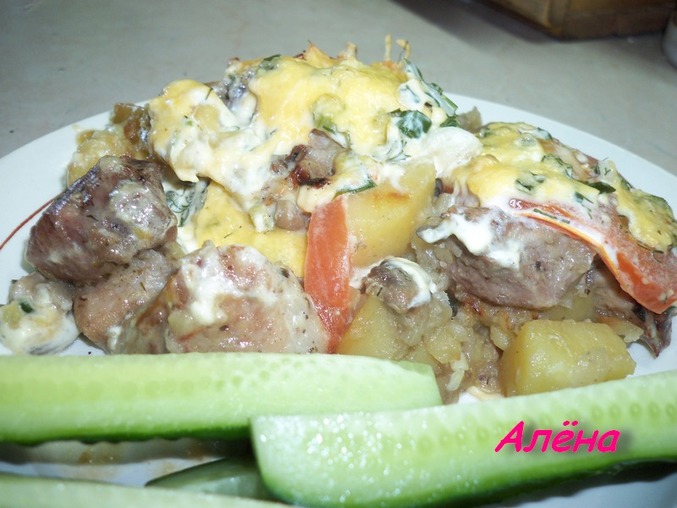 Редкий мужчина не любит картошечку с мясом, грибами, да со сметанкой и сыром. Мой не исключение, и вот его обед)