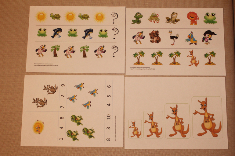 5. Математический блок (10 листов):Счет от 1 до 10, два листа "кто лишний?", два листа логических цепочек, расположить картинки от меньшей к большой.