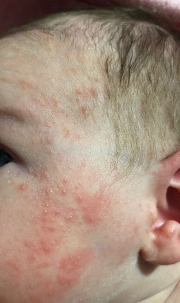 Начали появляться в разброс красные пятна, в основном на правой щечке, так же есть на голове