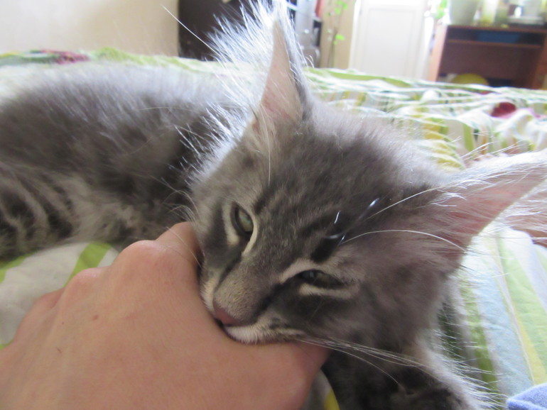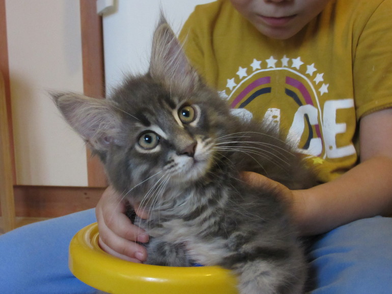 3 месяца. растет не по дням, а по часам. так, вроде, большой котяра, гоняет на машинке с хозяином(кстати, и один любит порулить):