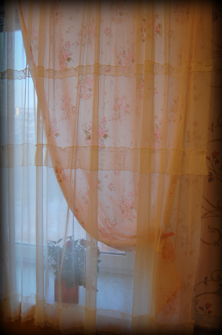 из 2 гардин можно 3 варианта делать-они двухслоынйе,первый слой-прозрачный с рюшами.второй-шелк розовый с цветами)
