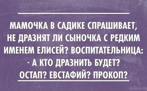Или как в анекдоте: Общаются мамочки на площадке, спрашивают как зовут деток - Милана, Милена, Эрика, Марк... И я одна, как дура, вывела погулять Вову))))