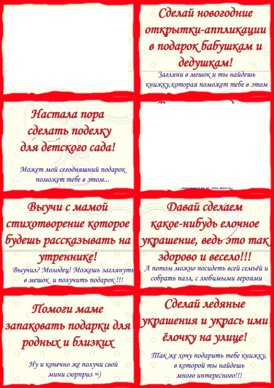 Очень классные идеи. Сразу видно, что вы долго и основательно готовились. Ребенок будет несомненно в восторге! У меня целый адвент-календарь книжечный. По книжечке в день. Мини-книжечки с рождественской тематикой. И есть адвент-календарь с фигурками на рождественскую тематику. Поэтому книжечки отпадают. А вот с заданиями оч.интересно. пожалуй парочку у вас повзаимвствую.