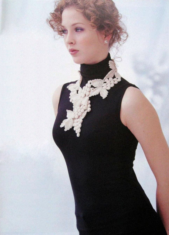 Воротник «Виноградная лоза» ручной работы, связан крючком из качественной турецкой пряжи: полиамид-80%, полиэстер-20%, что позволяет ему хорошо держать форму. Размер изделия 62x10 см. Работа выполнена в технике ирландского кружева в серебристом варианте, где объемные мотивы придают воротнику неповторимое очарование. «Виноградная лоза» прекрасное дополнение к однотонному изделию или просто оригинальное украшение на шею для стильных девушек и дам, которые хотят выглядеть неповторимо всегда и везде.