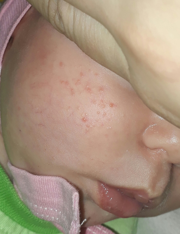Ребёнок как обычно себя ведет, спит, кушает да какает. А мне хотелось бы разобраться. Сегодня новые единичные прыщики только есть.. остальные побледнели