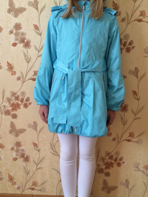Внутри утеплён флисом (спина и перед), рукава не утеплены. Плащ в очень хорошем состоянии. Одевали несколько раз в школу, носили очень аккуратно. Цвет яркий.