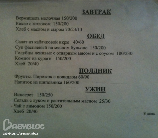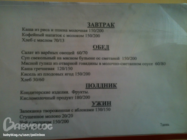 Ну меню стандартное... и все зависит от поваров и заведующей - насколько она поваров контролирует. Потому что каша молочная и каша, сваренная на воде и забеленная молоком - разные вещи. Еще от качества крупы зависит, оно в нашем саду было недорогое.
