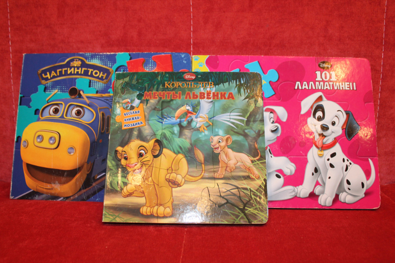 Книги-пазлы Чаггингтон, Король-Лев, 101 далматинец. Пазлы из 9 частей на каждой странице. Чаггингтон похуже, остальные в идеале. Каждая по 100 рублей.