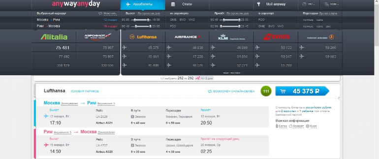 Время для поездки взято "от фонаря" (12-19 января 2015 г.), но если поиграться с датами, то можно найти варианты еще более выгодные. Страны и города также взяты навскидку (смотрела первое, что приходило в голову).