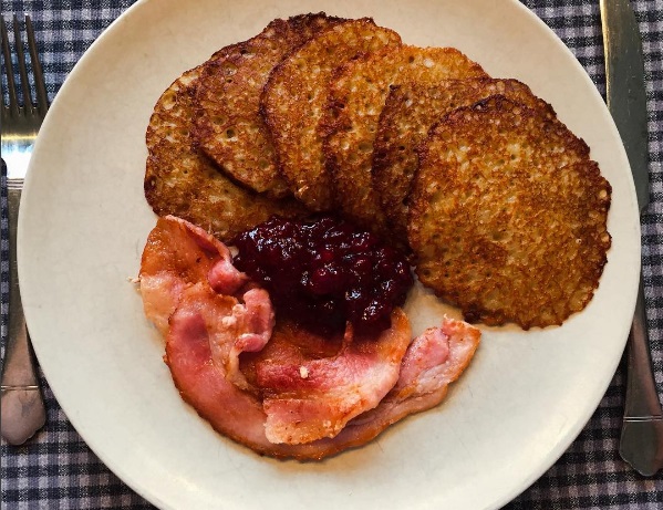 Это нечто среднее между драником и блином. Тесто готовится из муки, молока, яиц и тертого картофеля. Традиционно раггмунки подают с жареным беконом и брусничным джемом. Но встречаются варианты с грибами и другими овощами.