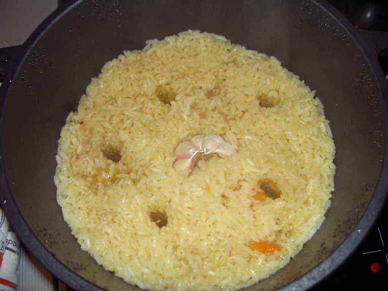 Накрываем крышкой и варим до впитывания воды в рис. Затем в серединку кладем головку неочищенного, но промытого чеснока. Делаем в рисе до самого дня палочкой отверстия для выхода пара и готовим под крышкой еще минут 20.
