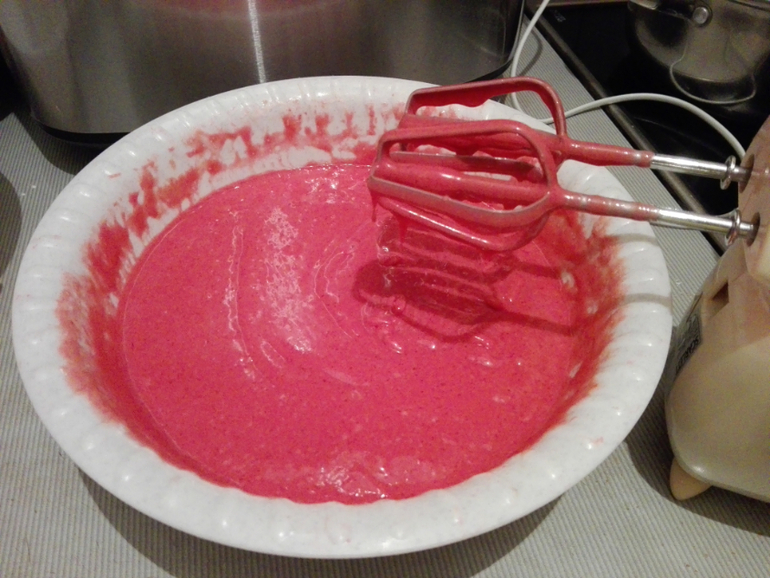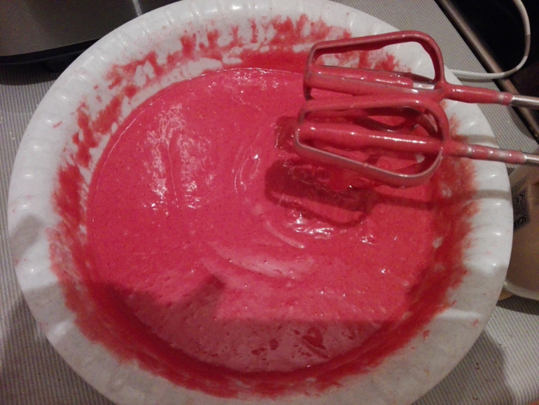 В миске смешаем все сухие ингредиенты. Следом добавим яйца, растительное масло, пахту (или сливки со сметаной), пищевой краситель. Все тщательно перемешиваем миксером до однородного состояния. Тесто получается довольно жидкое.