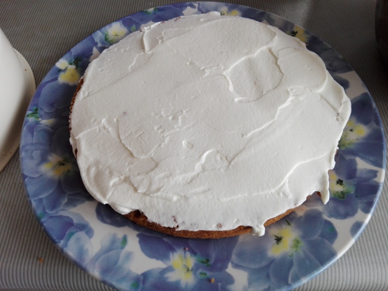 Каждый корж, а также верх и бока торта обильно промазать кремом.
