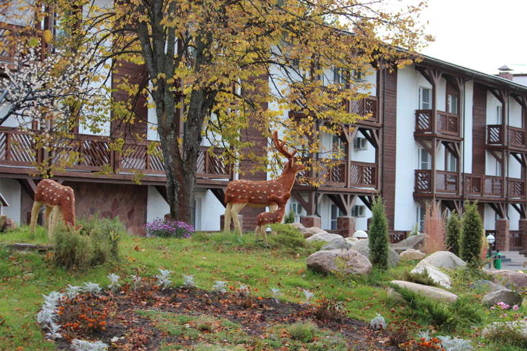 Из особенностей: «Юхновград» принимает с животными, это может быть, как плюсом, так и минусом. Для меня это был минус, я очень боюсь собак, а по территории ходили два лабрадора, в результате я боялась отходить от домикав одиночестве.