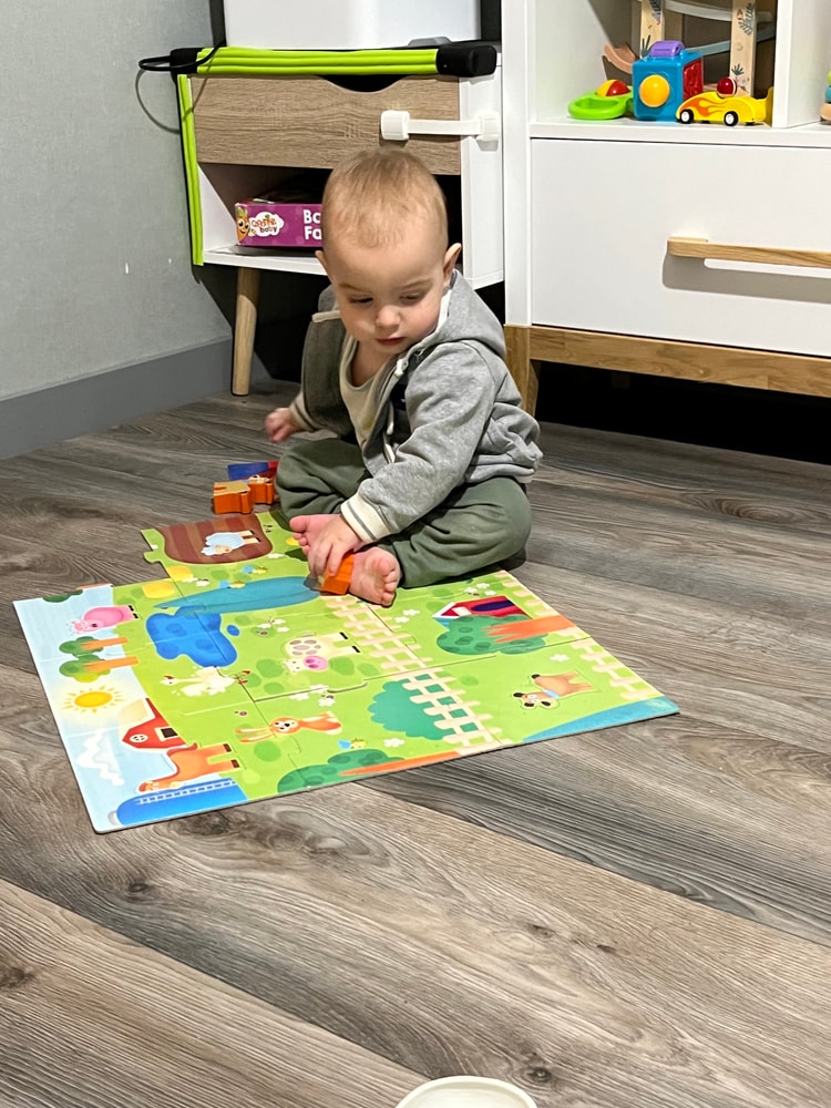 Это, кажется, его нынешняя зона роста. В год он умел засовывать в дырки только круглые предметы. Сейчас научился собирать пирамидку не по порядку и во всю пыжится над сложной сортировкой. Забрал себе все крышки от кастрюль, поильников, банок. Каждый день закатывает истерику на площадке, чтобы я открутила ему гайку, а когда откручиваю - закатывает истерику, что не может прикрутить на место. Страстно любит книги с картонными фигурками для вставляния. Давно находит соответствия между одинаковыми картинками в них и вставляет все круглое (мяч, помидор), а сегодня без моей помощи вставил дубовый листик и медвежонка.