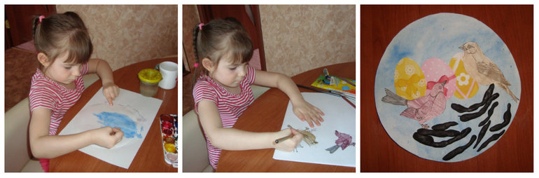 И напоследок сделали аппликацию "Птицы в гнезде", нам как раз пригодились распечатанные яички.