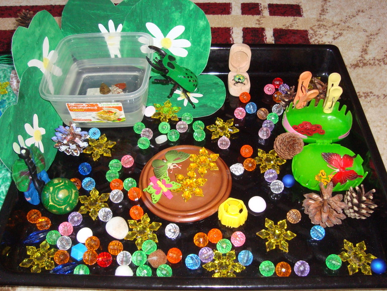 Сенсорную коробку ( даже две))) дочь делала сама и сама же потом играла. До сих пор не дает убирать. Я помогала лишь подбором материала.