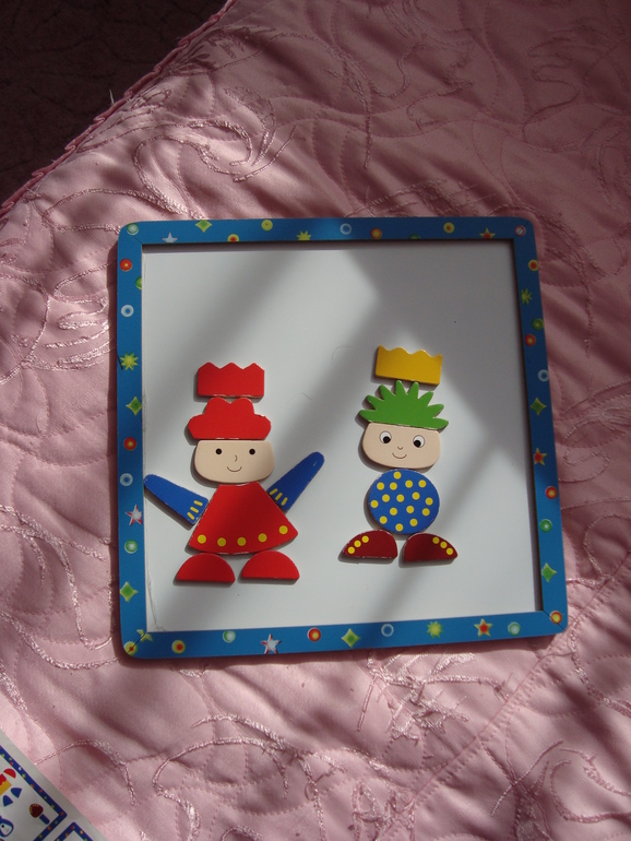 Готовлю игрушки и вещички для маленькой Сони, которую ждем в гости. Тася, увидев свою старую магнитную мозаику, решает немного поиграть. Делает фиксиков.