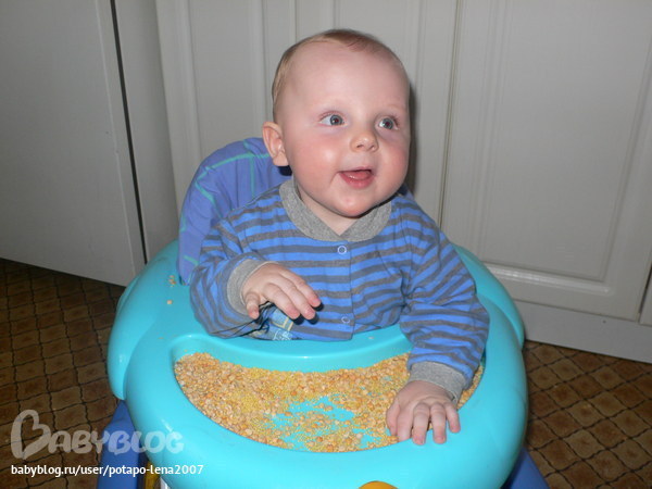 Макарка стал становиться на четвереньки, но ножки подгибает, а на ручках уже очень уверенно держится. Приобрели возжи и теперь с удовольствием он ходит сам и почти самостоятельно, даже на улице. Наверное сначала пойдет, а потом поползет С маленькими детьми пытается общаться и всегда очень радуется , когда видит кого-нибудь такого же роста. А сегодня я ему устроила праздник (где то узнала, что полезно для моторики). Насыпала на столик в ходунки разного рода крупу. Всего околу двух стаканов. Он так радовался, стучал ручками и раскидывал по всей кухне.