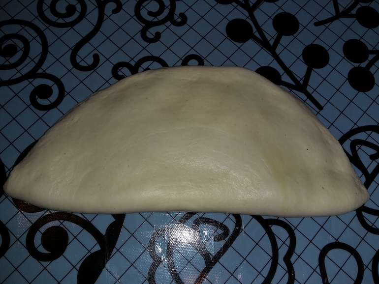 Раскатать в кружок, положить фарш (60% баранина, 35% лук, 5 % курдючный жир, соль, черный перец, паприка):