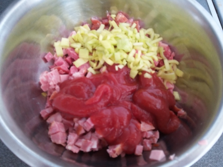 Смешать лук порей, ветчину, колбаски, кетчуп: