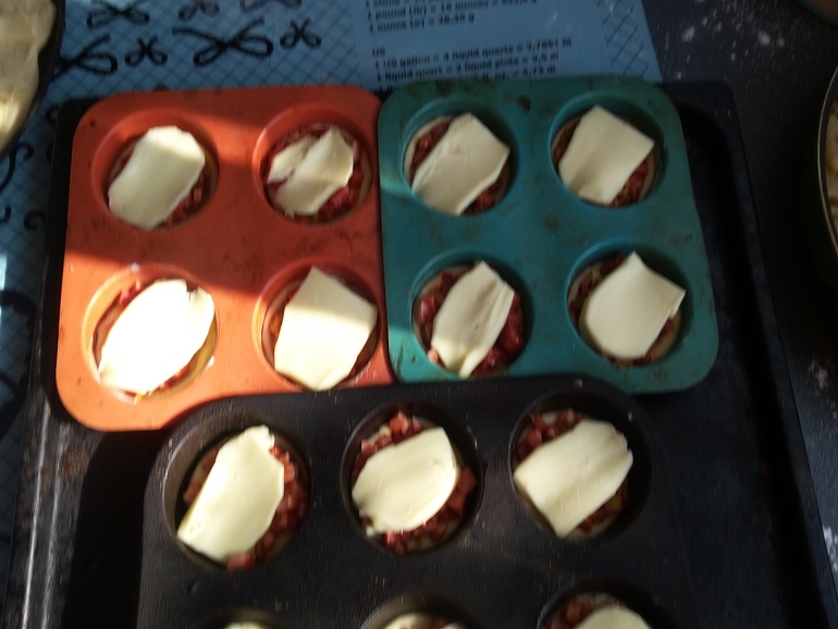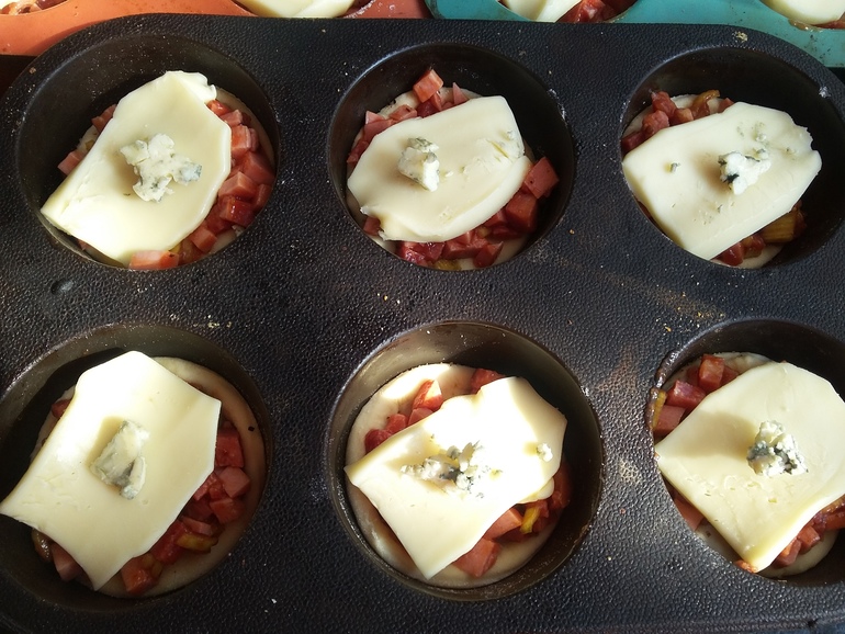Выложить кружки в форму для кексов, посыпать приправой для пиццы: