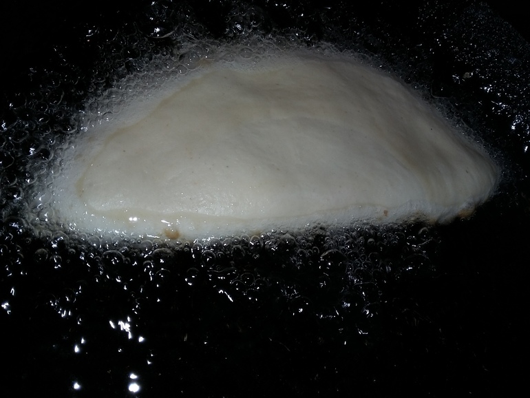 Положить в кипящее масло (95% растительного, 5% топленого или сливочного):