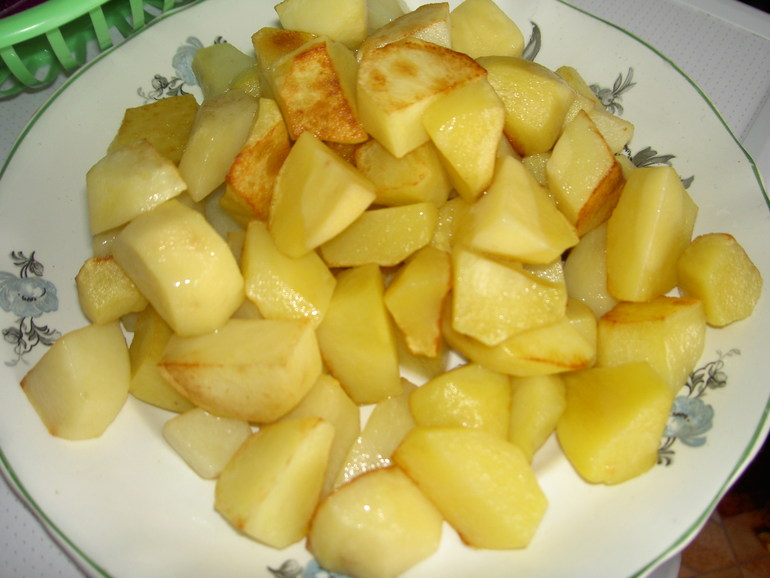 Обжарить на сковороде с разогретым растительным маслом дольки картофеля до румяной корочки.