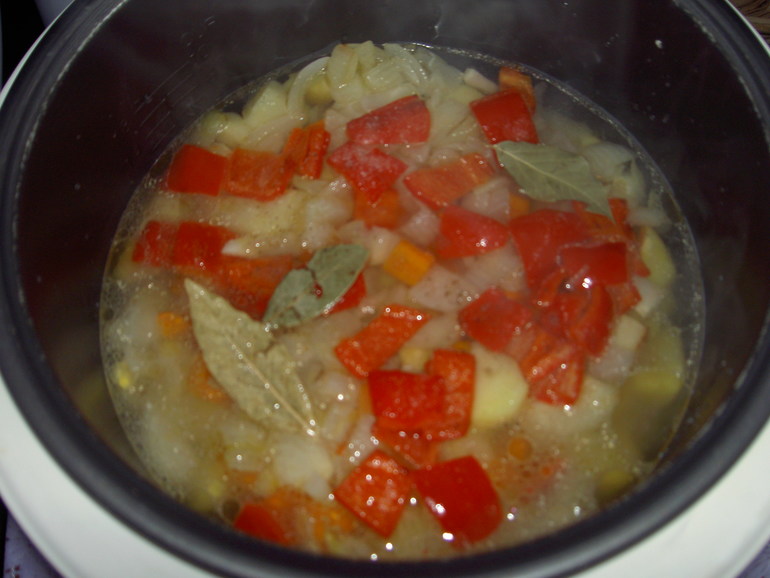 Выложить в большую кастрюлю или чашу мультиварки слоями: курицу, картофель, лук с чесноком, морковь, болгарский перец. Залить кипятком, чтобы овощи немного выглядывали из воды. Добавить соль, перец, лавровый лист.