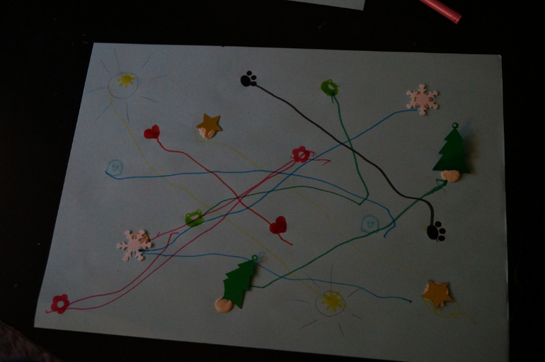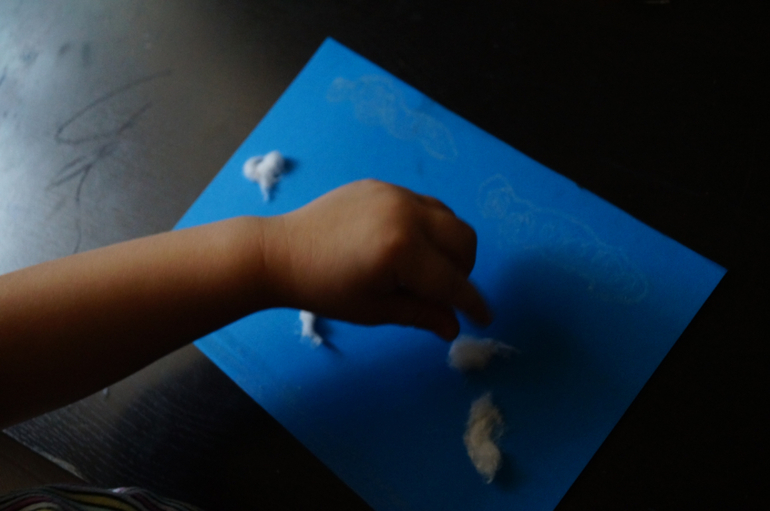 Клеили из ваты снег, а потом и облака тоже приклеили. Тоже, кстати, Поле Очень нравятся такие забавы!