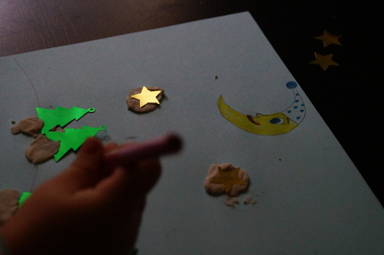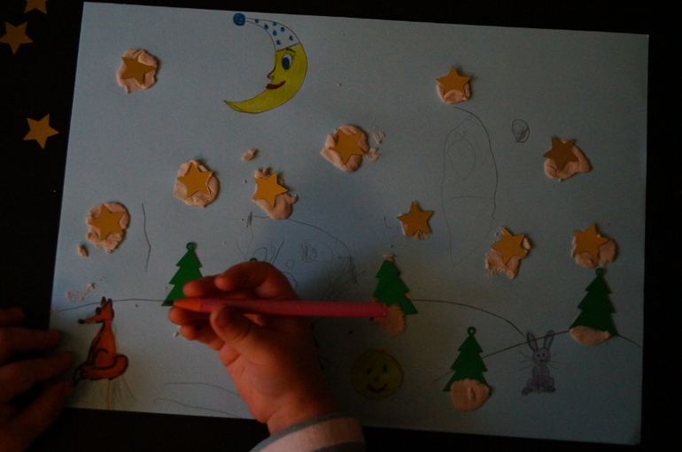 А это мы нарисовали ночь, и на пластилин (т.к. клей наш закончился) лепили всякие всякости.)))