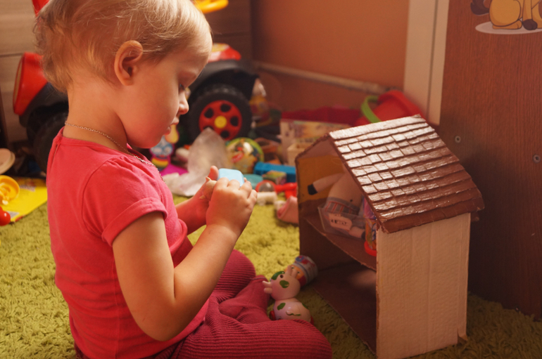 Поля любит ролевые игры. Папа смастерил нам мини-кукольный дом с двумя этажами, окнами, дверями и лестницей!