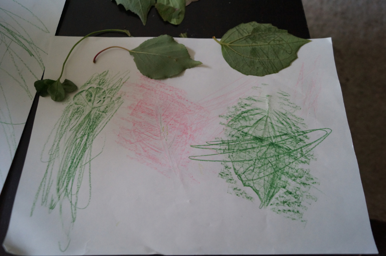 Начало осени мы отметили сбором еще зелёных листочком. Рисовали по ним мелками.